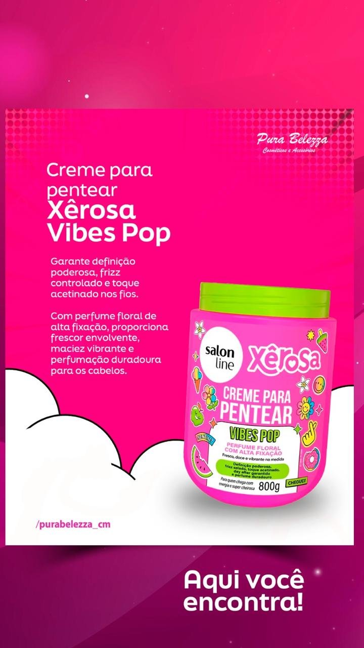O Creme para Pentear Xêrosa Vibes Pop garante definição poderosa, frizz controlado e toque acetinado nos fios. Com perfume floral de alta fixação, proporciona frescor envolvente, maciez vibrante e perfumação duradoura para os cabelos.