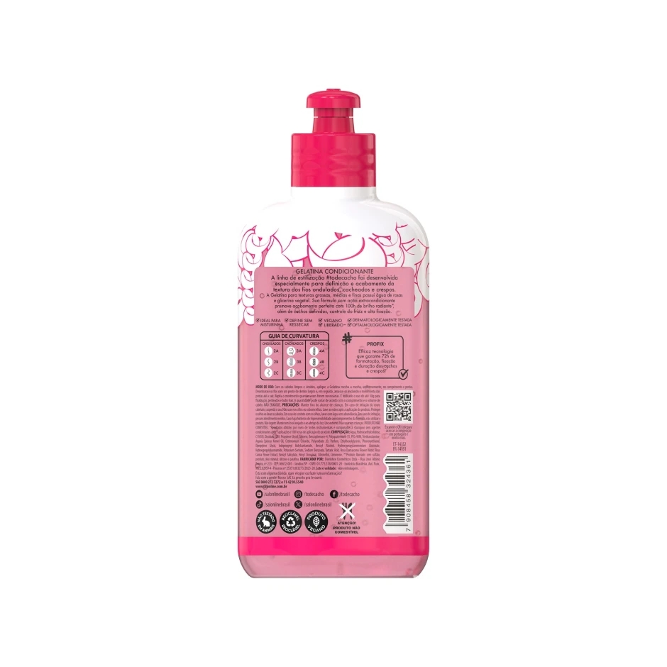 A Gelatina possui água de rosas e glicerina vegetal. Sua fórmula com ação extracondicionante promove acabamento perfeito com 100h de brilho radiante, além de cachos definidos, controle do frizz e alta fixação.