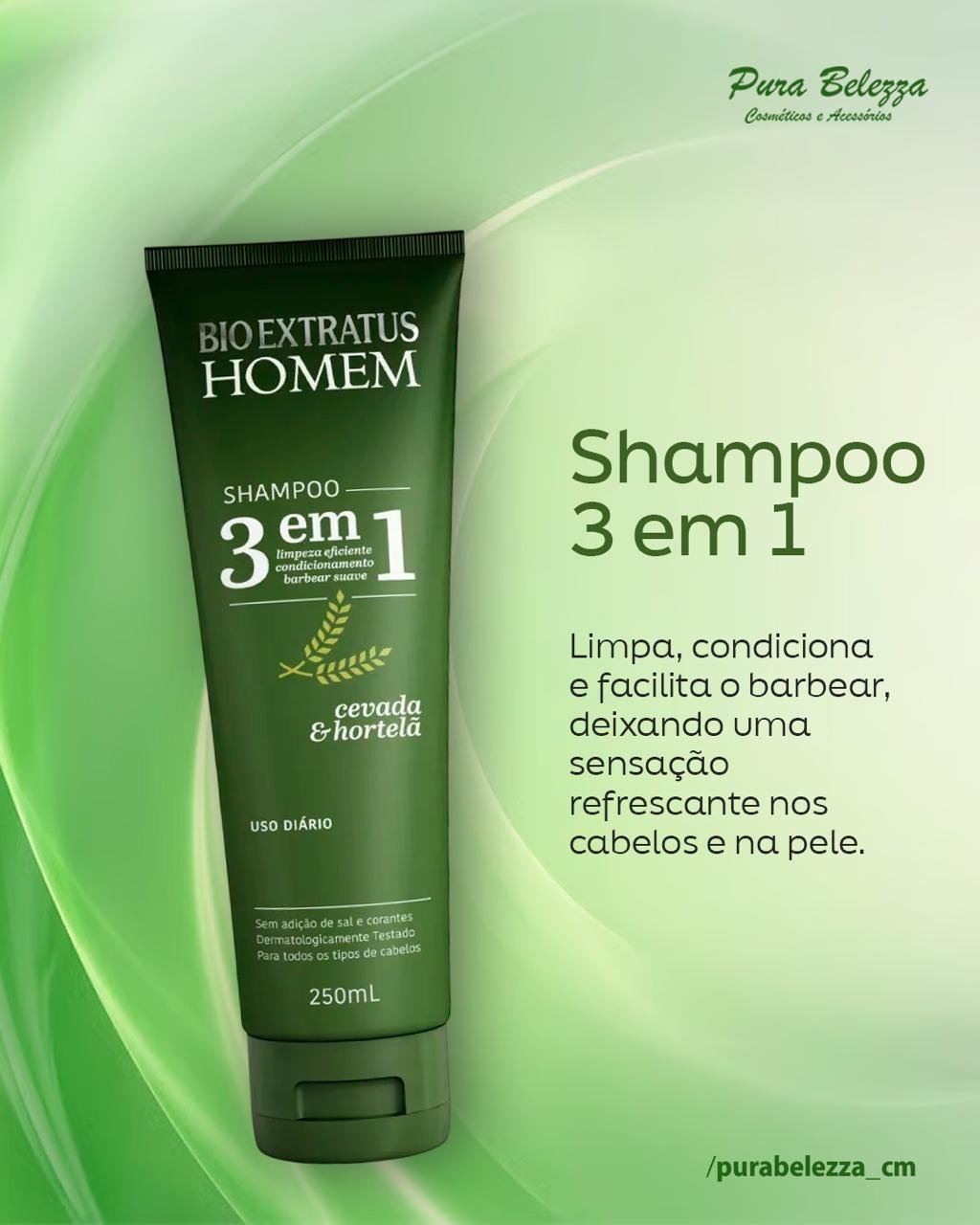 Limpa, condiciona e facilita o barbear, deixando uma sensação refrescante nos cabelos e na pele. pH 5,5. Sem adição de sal. Sem corante. 250ML